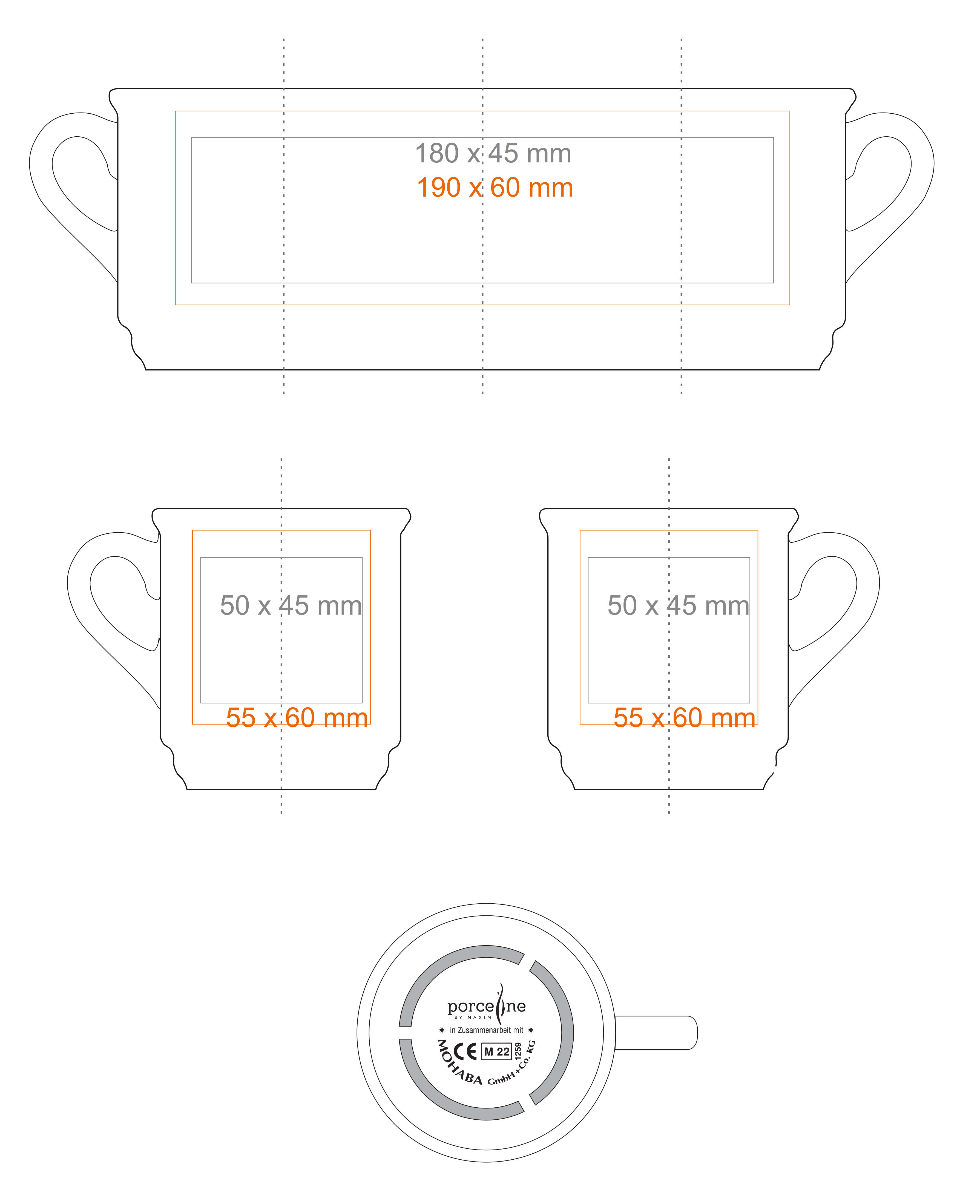 Auf der Innenwand (40x20 mm) Auf dem Boden innen (ø30 mm) Goldaufdruck Silberaufdruck Druck über den Rand Handarbeit - Einfärbung des Randes Personalisierung Personalisierung Graveur |