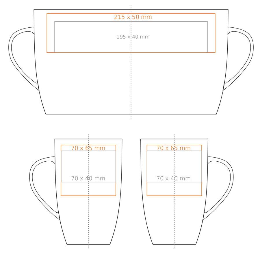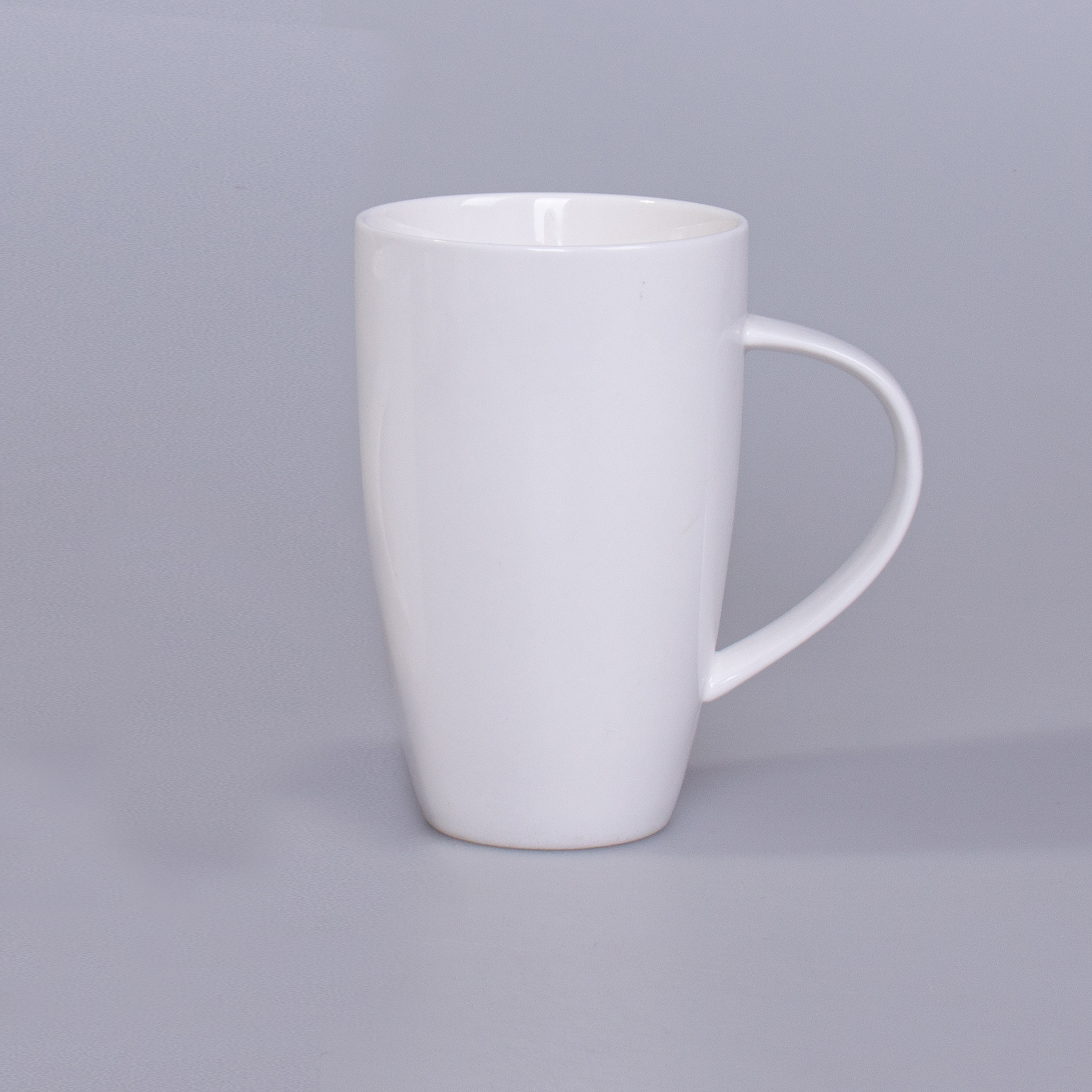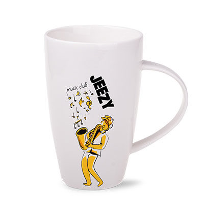 Ein hoher und schlanker Porzellanbecher. Er verfügt über einen stilvollen Griff. Er zeichnet sich durch großes Fassungsvermögen und vielseitige Druckmöglichkeiten aus.