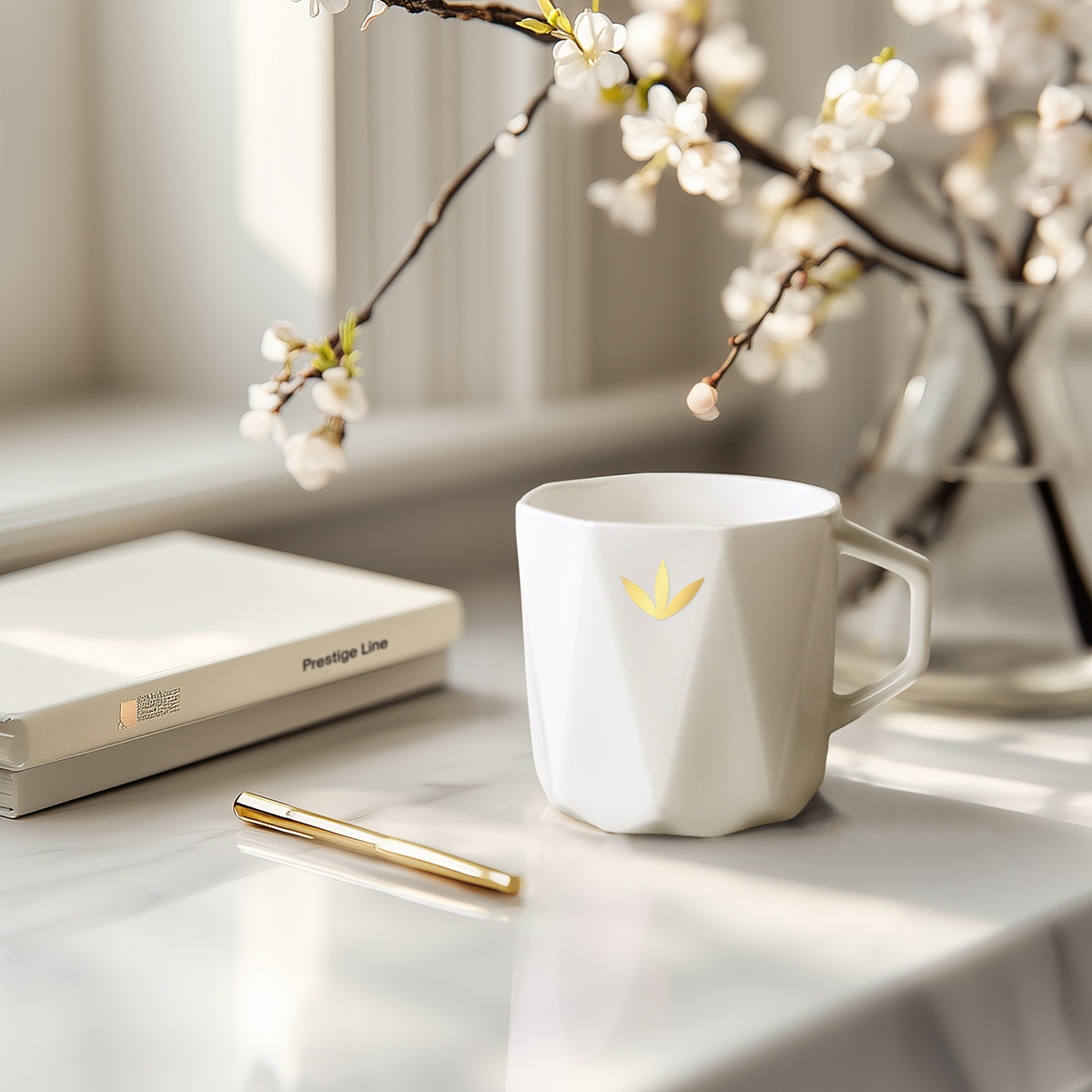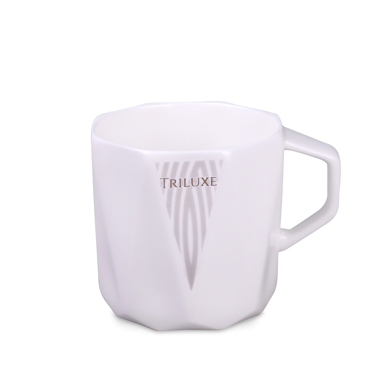 Ein prestigeträchtiger Becher aus hochwertigem Fine Bone China Porzellan. Er zeichnet sich durch seine einzigartige geometrische Form aus, die an einen Diamanten erinnert. Ein Vertreter der Prestige Line.