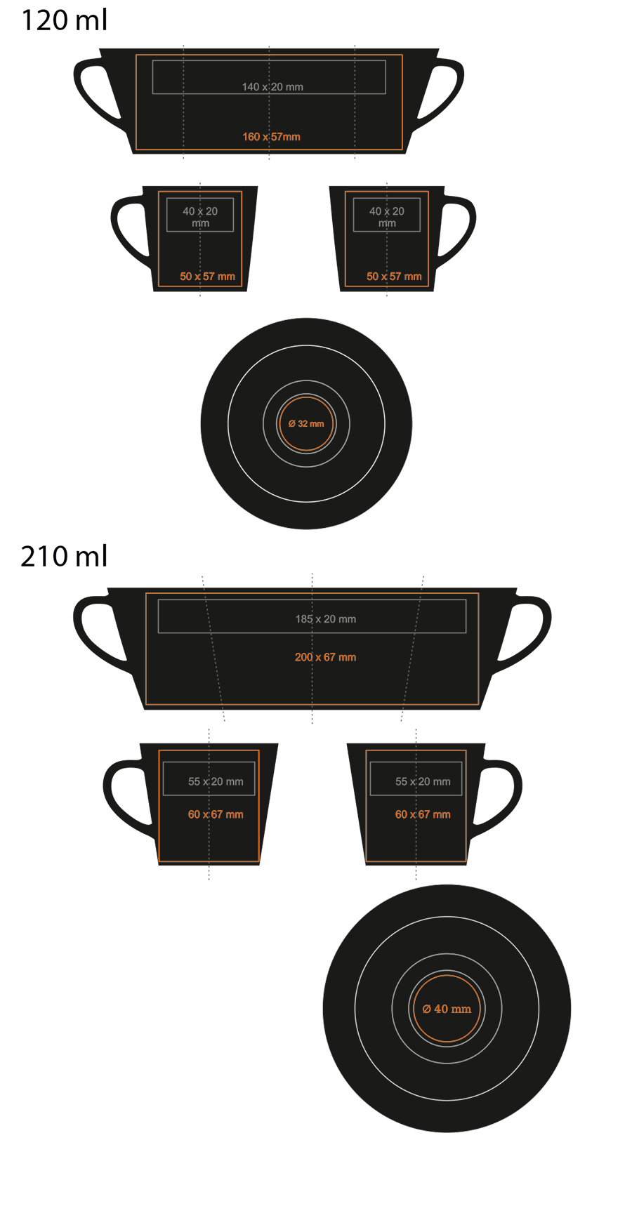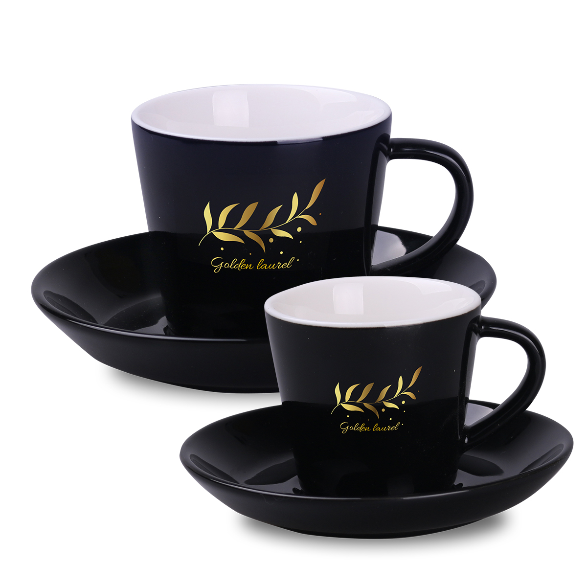 Eine schwarze Tasse mit einfacher, klassischer Form. Hergestellt aus Porzellan. Sie verfügt über einen ergonomischen Griff und bietet eine große Fläche für Verzierungen. Erhältlich in zwei Größen.